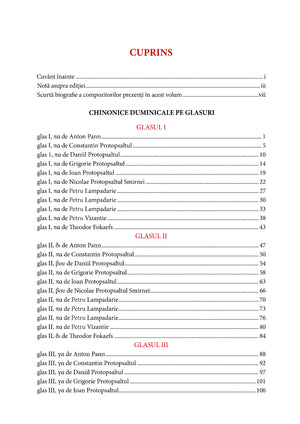 Volumul reunește Chinonice Duminicale ordonate pe cele opt glasuri, cu o dispunere clară și consecventă a pieselor în interiorul fiecărui glas. Această organizare permite orientarea rapidă în repertoriu, comparația stilistică între compozitori și alegerea conștientă a variantelor potrivite fiecărui context liturgic.
