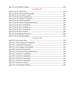 Repertoriul a fost stabilit pe baza formelor consacrate în tradiția manuscrisă și tipărită, urmărindu-se păstrarea ethosului modal, a cursivității melodice și a logicii interne a formularelor psaltice.